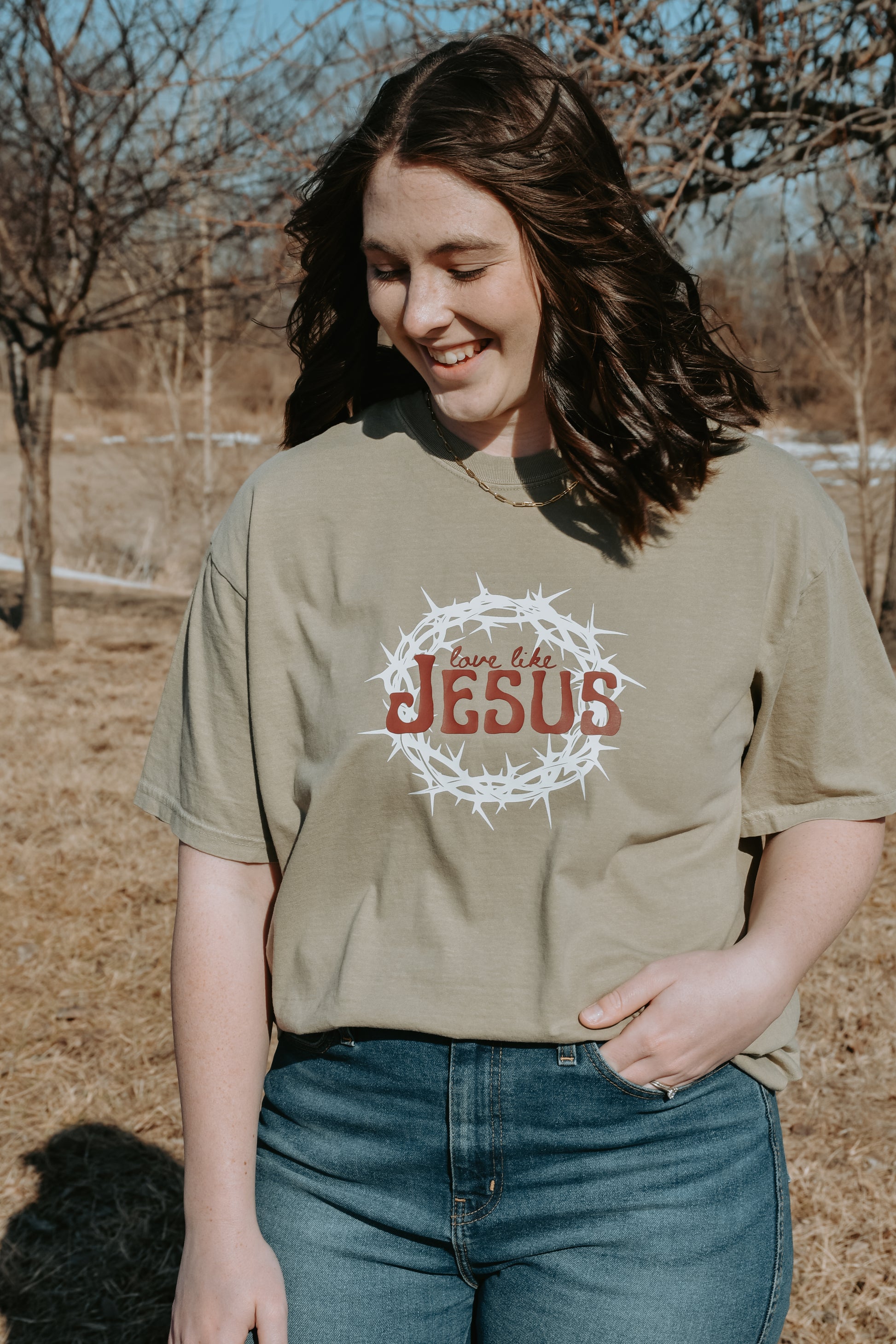 A powerful message for everyday that Jesus died for you and me. Available in black and Comfort Colors Khaki. Redeemed Co. original design.